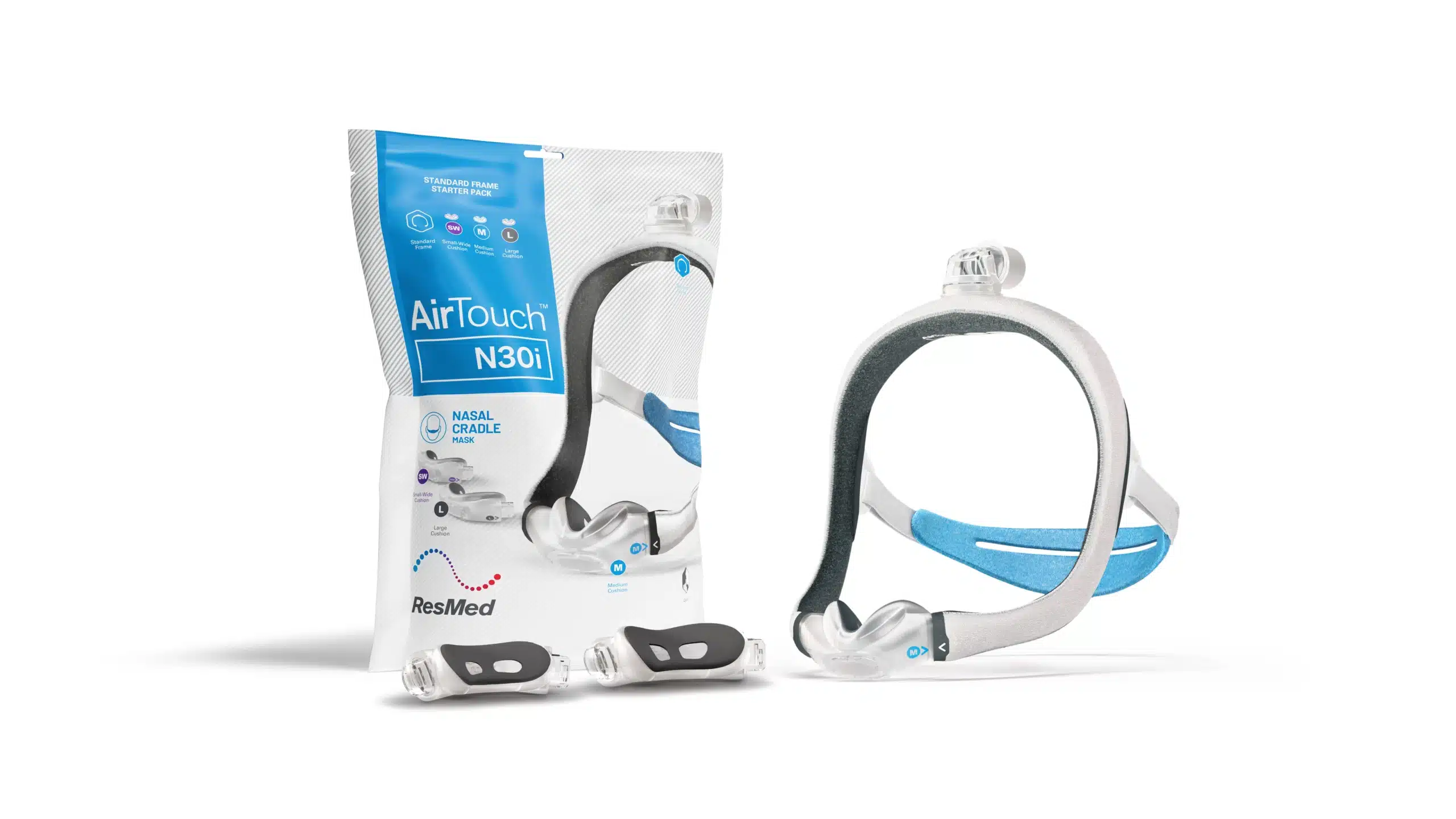 The ResMed AirTouch N30i Starter Pack offers a complete nasal CPAP mask system designed for comfort, stability, and reliable therapy. Featuring UltraSoft memory foam cushions and adjustable headgear, it ensures a secure seal while accommodating multiple face shapes. Available in Standard and Small sizes for an optimal fit.