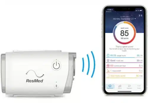 The ResMed AirMini is one of the smallest CPAP machines in the world. It is made to provide high-quality therapy in a small, portable package. It only weighs 0.66 pounds and is 5.4 inches wide, so it fits easily in any bag. This makes it easy to keep up with your therapy no matter where you are. The device has three modes: AutoSet, AutoSet for Her, and CPAP. It also has comfort features like Expiratory Pressure Relief, AutoRamp, and SmartStart to help you sleep better. The AirMini also has optional HumidX cartridges that let it humidify without water, so it doesn’t need a water chamber like most other humidifiers. The AirMini app for iOS and Android lets you keep an eye on therapy data and settings. The device is also approved by the FAA for use on planes.